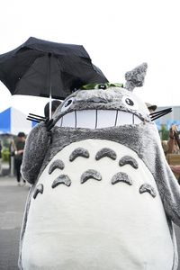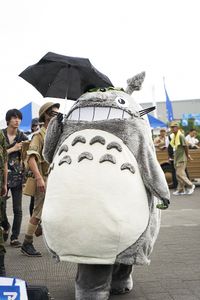 会場となった東京臨海広域防災公園で見つけたのは、『となりのトトロ』(88)のトトロ。炎天下にも拘わらず、我々が取材を行った10日、12日の2日間とも遭遇し、全身を覆われるこのコスチュームで長時間会場を闊歩していた。同じく、ジブリ作品の『紅の豚』(92)に登場する元イタリア空軍のエース・パイロット、ポルコ・ロッソも発見。おなじみの不敵な笑みを浮かべながら、撮影に応じてくれた。