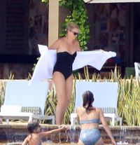 18日にバハマのビーチで目撃されたシャーリーズは、長袖にハイネックの完全UV対策水着を着用。大ぶりの麦わら帽子にサングラスをかけているため、一見シャーリーズには見えないが、長くて形のよい美脚を見れば本人であることは一目瞭然。落ち着いた色調のワンピース水着で上半身がカバーされている分、滑らかな細い脚が一層際立って見えている。