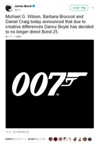これは「007」の公式ツイッターアカウントが「プロデューサーのマイケル・G・ウィルソン、バーバラ・ブロッコリとダニエル・クレイグが、クリエイティブな意見の相違によりダニー・ボイル氏が『Bond 25』の監督を辞退したことを発表しました」とツイートしたことが情報源だ。