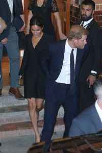 いつもは膝下のスカートやパンツスタイルが多いメーガン妃だが、今回は何と超ミニのタイトスカートで登場。メーガン妃が選んだのは、カナダ発のブランド「ジュディス&チャールズ」のタキシードワンピで、素肌に直接ミニ丈コートを羽織っているようなデザインだ。