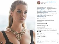 オールバックにしたセミロングヘアに、ダイアナ妃を彷彿させるブルーの瞳が美しいキティがネックレスを着けている様子や、華やかにカールしたヘアスタイルに、緑と赤の対比が美しいスネークブレス、ブルガリのブローチがあしらわれたグレーのジャケット姿の写真が投稿されている。