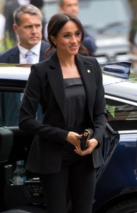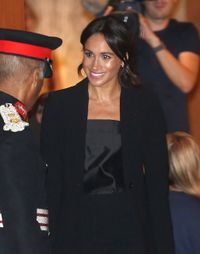 この日のヘンリー王子は定番のネイビースーツ、メーガン妃は黒のパンツスーツという出で立ちで登場。先月のチャリティイベントでは超ミニで話題を集めたメーガン妃だが、今回は肌見せを封印し、キャリアウーマン風の装いでの出席だった。メーガン妃が選んだのは、ニューヨークのラグジュアリー・ブランド「アルチュザラ」のパンツスーツで、お値段は1490ポンド(約21万円)。ジャケットの下には、スウェーデンのブランド「DEITAS」の黒キャミソールを合わせ、全身を黒で統一したフォーマル感たっぷりのスタイルだ。