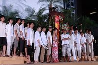 無人島に漂流した女1人、男23人の奇妙な“逆ハーレム”生活を描く、桐野夏生の小説を映画化した『東京島』(8月28日公開)。本作のユニークな完成披露試写会イベントが8月3日に開催され、恵比寿ガーデンプレイスのセンター広場に、一夜限りの“東京島”が出現! 主演の木村多江が18人の草食男子に珍スタミナ料理をふるまって、暑気払いのヒット祈願を行った。