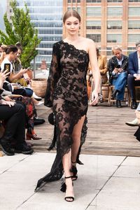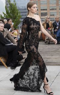 今回も乳首見せ、太もも見せは当たり前の2人は、オスカー・デ・ラ・レンタのランウェイで共演。太ももまでスリットの入った黒いレースのワンショルダーのドレスを着て登場したジジは、ベージュのインナーを着ているからか垂れ乳ではなく、かの有名な巨大な乳輪がバッチリ覗いている。