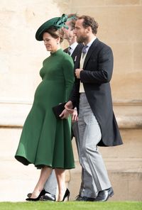 ピッパは、ヘンリー王子とメーガン妃の挙式にもモスグリーンのドレスで出席しており、グリーンがお好きな様子。お腹はかなり前にせり出ており、大きく膨らんでいるが、フレアスカートのラインもエレガントな着こなしだ。