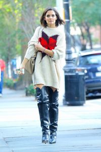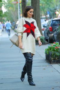 そんなケイティが、珍しく気合の入ったファッションで外出している姿がキャッチされた。スマートフォンを片手にニューヨークの街を歩くケイティは、オーバーサイズのニットワンピースにニーハイブーツのカジュアルな出で立ち。クリーム色のざっくりとしたニットはかなりのミニ丈で、胸には大きなポインセチア柄がデザインされている。