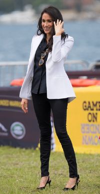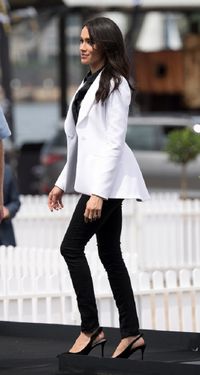 あいにくの雨模様だったこの日、メーガン妃は低い位置で後ろに1つに束ねたポニーテールに、白いシャツ、オーストラリア・ブランドのアウトランド・デニムのジーンズと米J.クルーのアンクルブーツ、そして親友のセリーナ・ウィリアムズが手掛けたチェックのオーバーサイズのブレザーという、前日とは全く違う装いで、シドニー郊外の学校を訪問した。