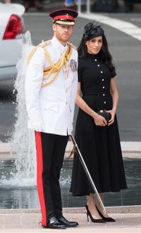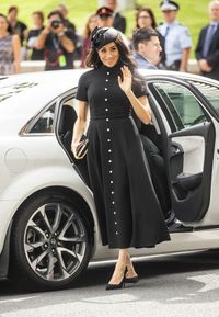 この日のメーガン妃は、ニュージーランドのデザイナー、エミリア・ウィックステッドのブラックワンピースを着用。前面中央に17個も付けられた飾りボタンとハイネックが特徴的なブラック・ドレスは、くるぶし近くまであるロングのフレアスカートがクラシカルな印象だ。お値段2927オーストラリアドル(約23万円)のドレスに合わせたのは、王室御用達の帽子デザイナー、フィリップ・トレーシーのピルボックス帽。実は4月にロンドンで行われた「アンザック・デイ」の時も、メーガン妃は全く同じブランドの組み合わせで出席している。今回も同様の主旨の式典とあって、ニュージーランドと英国のブランドを再度共演させたようだ。