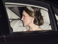 政治的な意味合いを持つイベントとあって、アップにしたヘアには、過去にも着用したことのある故ダイアナ妃が愛したダイヤとパールの“ラバーズ・ノット”のティアラに、故ダイアナ妃のお気に入りだったパールのイヤリング、また、エドワード7世が、デンマーク国王クリスチャン9世の娘アレクサンドラに贈ったもので、1863年の挙式で身に着けていたとされるパールとダイヤのネックレスという装い。キャサリン妃にしてはかなり大ぶりのデザインだが、徹底的に英王室をリスペクト。
