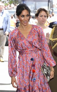 このドレスはニューヨーク・ブランド「フィグ(Figue)」のもので、お値段は1151ポンド(約17万円)。同ブランドは各国の文化を反映させたデザインが特徴で、今回メーガン妃の着用したドレス“Frederica”は、メキシコ人女性画家、フリーダ・カーロにインスパイアされたデザインだという。4色のカラフルなポンポンがついたリボンベルトや、ふんわりとしたぺザントスリーブが愛らしく、妊娠中のメーガン妃を優しげな印象に見せている。