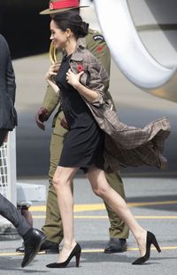 タラップを下りる時にミニドレスと美脚を見せたかったのか、メーガン妃はコートのボタンを留めずに前を全開にしていたが、これは強風の中では失敗策だった様子。コートの襟も裾も舞い上がり、メーガン妃は服の乱れを押さえるのに苦労していた。メーガン妃好みのラフなまとめ髪も、風に吹かれたおくれ毛を撫でつけるのに大忙しとなり、強風のさなかには不向きなファッションだったようだ。