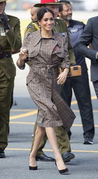 メーガン妃はこのドレスに、ニュージーランド出身のデザイナー、カレン・ウォーカーの540ポンド(約7万8000円)のトレンチコートを羽織り、足元はニューヨークブランド、サラ・フリントの207ポンド(約3万円)のブラックハイヒールを着用。アクセサリーはカナダの老舗宝飾ブランドBIRKSの黄水晶とダイヤのイヤリングで、1729ポンド(約25万円)分の高級感を添えていた。