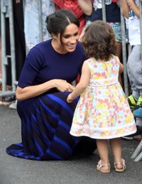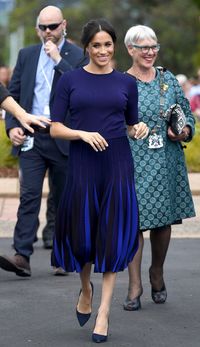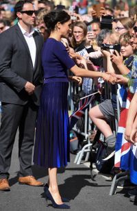 初の長期外遊の締めくくりの装いに、メーガン妃はウェディングドレスをあつらえたブランド、ジバンシィのアンサンブルを選択。ネイビーカラーの薄手の半袖セーターに同色のプリーツスカート、そして定番となったおくれ毛を垂らしたまとめ髪で、ファンとの交流に努めていた。