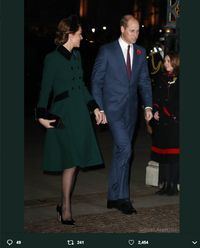 黒一色だった昼間の追悼式典と異なり、英王族の女性メンバーは色味のある服装で出席。キャサリン妃もブラックフォーマルから着替え、ダイアナ妃の愛用していた英ブランド、キャサリン・ウォーカーのダークグリーンのコートでお目見えした。実はこのコートは、昨年のセント・パトリックデーの時に着ていたのと同じものだったが、ヘアアクセサリーで新鮮な印象を作り上げたようだ。