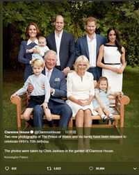 11月14日、チャールズ皇太子が70歳の誕生日を迎えたことを記念して、エリザベス女王を抜いた一族9人を捉えた2枚の写真が、ケンジントン宮殿の公式サイトでお披露目された。