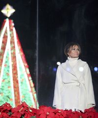 その後、28日にワシントンDCで行われた恒例の点灯式には、寒空のなかアップにしたヘアスタイルに白いニットのハイネックワンピ、2000ドル(約22万6000円)のマックスマーラのコートと白い革の手袋という出で立ちで登場。ニーハイブーツは薄いベージュのスウェード素材だが、ほぼ全身白という完璧コーデで、黒いコートの夫トランプ米大統領とともにイベントに出席した。