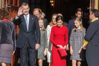 夫のフェリペ6世と2人の娘とともに、日中のイベントでは低めにまとめたシニヨンに、9月にスペイン北部のアストゥリアス州のイベントで着ていたキャロリーナ・ヘレラの赤いペンシルドレスを着回ししたレティシア王妃。