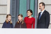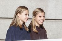 娘のレオノール王女(13)とソフィア王女(11)のワンピはトレンドのグレンチェックで、お揃いに見えて今回も微妙に色味やデザインが違うという徹底ぶりで、ハイソックスとローファー、ケープはレオノール王女が紺で統一、ソフィア王女はエンジのソックスとローファーに、茶のケープという、ドレスに入っている色味をさりげなく取り入れた上級のおしゃれコーデで、バルコニーに姿を現した。