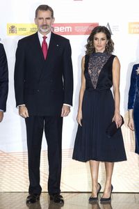サテンのクラッチバッグにスウェードのパンプス、サファイアとダイヤのティアドロップイヤリングまですべてネイビーと極めてシック。また今回も、夫のフェリペ6世のスーツカラーとのコーデもばっちりだ。