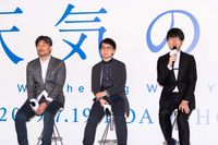会見の冒頭、川村プロデューサーは「完成前ではありますが、すでに全世界から配給のオファーが来ています」と『君の名は。』以上の拡がりを見せることを示唆。「『君の名は。』が大きい成功だったので、チャレンジャーとして映画が作れるかを主眼に置いた。世界で受け入れられるようなテーマを含んでいる作品になると思っている」と述懐し「雨、空、雲など、まだ残されてる新海さんの新たな映像表現が存分に観られる作品です」と、世界中に熱狂的なファンを持つ“新海ワールド”の新たな一面に自信をのぞかせた。