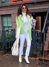 今月初めに、2日間にわたってニック・ジョナス(26)と盛大な挙式を行った新婚ホヤホヤのインド人女優プリヤンカー・チョープラー(36)が、トレンドの真っ白な出で立ちでニューヨークに降臨。愛犬ダイアナの装いも話題になっている。