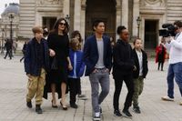 外出時は常に黒かベージュ系のモノトーンで決めているアンジェリーナだが、これまでと違ってブルネットヘアをヘアマニキュアでブロンドとツートンカラーにして軽やかに、また千鳥格子のジャケットを着ていたパックスを意識したのか、モノクロの柄物が施されたリバーシブルのフェラガモのケープを羽織り、赤色が入ったフェンディのサングラスでファッショナブルに決めており、イメチェンを図っているようにも見受けられる。