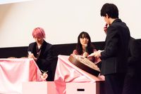 そして間もなくバレンタインデーということで、上白石の手作りチョコをかけて杉野と横浜が対決。大きなチョコに胸キュンメッセージを書き込んで、それを声に出して披露し、上白石の心を掴んだほうがチョコをゲットできるというもの。ステージに運び込まれた大きなチョコにホワイトチョコのチューブで綺麗に「大切」と描いた杉野に対し、チューブの扱いに不慣れでこぼしそうになりながら、ぎこちなく「大好き」と描いた横浜の苦労が奏功し、軍配は横浜に。杉野は「俺が選ばれるんだろうなと思ってた…」とせつなそうな表情を浮かべたものの、2人の甘いメッセージに会場からは黄色い声援が鳴り止まなかった。