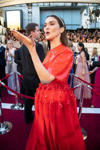 レッドカーペットに登場するや否やネットで「一体どうしちゃったの?」「衝撃!」と話題を呼んだのが、ファッショニスタのレイチェル・ワイズだ。ジバンシィのオートクチュールドレスで、トップスがラテックス素材のケープ、ボトムスがチュールという異素材の赤いドレス、ぴったりとしたセンター分けのヘアにジュエリーのヘアバンドという装いで、夫のダニエル・クレイグとともに出席。