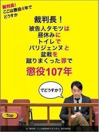 それに先駆けiPhoneではただいま、本作のおもしろ無料アプリを展開中だ。「タモツの罪つくりメーカー」なるこのアプリは、入力画面で被告人の名前(自分の名前)を入力すると、スロットで自動に罪が作成され、判決ボタンを押すとその罪の懲役が表示される。本作の主人公タモツがあなたの罪を作ってくれるのだ。ちょっと不謹慎かもしれないが、それもまた本作の魅力の1つなので、軽いシャレと思って楽しもう。また“罪つくりメーカー”の他にも、予告編やイントロダクションなどのコンテンツも充実しているので、公開前の予習にもぴったりだ。