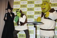 同シリーズのギネス世界記録認定と、今作の日本の公開を記念し、11月9日に都内でシュレックスペシャルサポーターとなったハリセンボンの就任式イベントが行われた。就任式では、魔女に扮した箕輪はるかが登場し、「春菜! 春菜!」と呼ぶと、大きなシュレックが登場。シュレックに「春菜、こんな姿になっちゃって」と話しかけると、「ちょっと待てよ!」と大きな声と共に、顔を緑に塗りシュレックに扮した春菜が登場。「シュレックじゃねーし!」のギャグでおなじみの春菜は、サポーター就任に「散々、『シュレックじゃねーし!』と否定してきたのに、今さら認定なんておせーし! どうせなら前々作、前作からオファーして欲しいし!」と春菜節を炸裂。シュレックに変身した自身について「意外としっくりきてます。初めてシュレックになった自分の姿を鏡で見て、一筋の涙が流れました。正直、似すぎていて親に申し訳ない」と複雑な表情をのぞかせた。一方のはるかは、今作を「前作のハッピーエンドから、物すごい壮大なストーリー展開になっています。しかも3Dの奥行きがすごく、見ていて驚きました」とPRした。