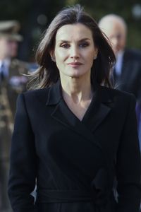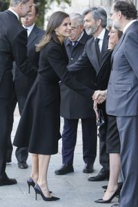 まだ寒かったこともあり、この日レティシア王妃が喪服に選んだのは、キャサリン妃の御用達ブランド、キャロリーナ・ヘレラの黒いベルト付きのAラインコート。ストレートヘアにシンプルなピアス以外はネックレスもなく、ミニマルなアクセサリーに黒のクラッチバッグと黒いパンプスという超シンプルな装いだ。