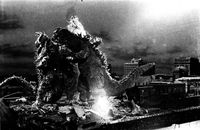 (対 カマキラス)3匹のカマキラスが食べようとする息子ミニラを救うため参戦。3匹で飛びかかってくるカマキラスを叩き伏せ、放射熱線で2匹を倒す。恐れをなした1匹は逃げていった。