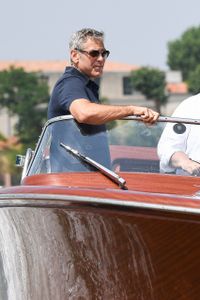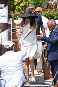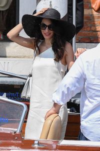また日中のランチでは、2人揃ってサングラス姿で、挙式の際と同様に水上ボートに乗り込む様子などをパパラッチされているが、アマルはお得意のオフショルダーの白いミニスカドレスに、白いショルダーバッグとベージュのサンダル、黒いストローハットで日差しをばっちりガード。カジュアルながらもエレガントな装いだ。
