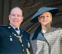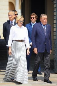元アスリートとあって、F1レースやル・マン24時間耐久レースなどスポーツイベントに積極的に参加しているシャルレーヌ公妃は、ヒートウェーブの影響で33度という高温に見舞われたこの日、ウェービーヘアに長袖の白シャツと、白とグレーのストライプロングスカートという装い。サングラスから覗く表情もあまり変わらず、汗ひとつかいていないようで、クールで涼しげだ。