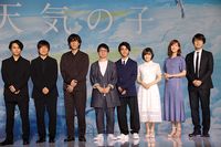社会現象とも言える大ヒットを記録した『君の名は。』(16)以来、約3年ぶりとなる新海誠監督の最新作『天気の子』(7月19日公開)の製作報告会見が7月2日に東京都内で行われ、新海監督、声優を務める醍醐虎汰朗、森七菜、本田翼、音楽を担当するRADWIMPS(野田洋次郎、桑原彰、武田祐介)、川村元気プロデューサー が登壇。国内では359館、448スクリーンという東宝配給作品史上、最大級規模での公開となるなど大きな注目が集まっているが、新海監督は「エンタテインメント大作として絶対におもしろい、損をさせない」とモットーを掲げながらも、「観た人の意見がわかれる映画かなと思います。そこが攻めている部分かなと。東宝の夏の映画として、“王道の物語”とは少し違うことをやっている」と攻めの姿勢で臨んだことを明かした。