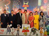 笑顔で手をふる日本語声優を務めた竜星涼、唐沢寿明、戸田恵子、新木優子 [c]2019 Disney/Pixar. All Rights Reserved.