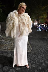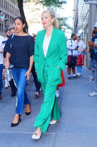 ファッショニスタのシエナとあって、後ろに一つに束ねた三つ編みを茶のヘアアクセでまとめたヘアスタイルに、ラルフローレンの茶のミュールサンダルという一見ラフな出で立ちだが、素肌にネックレスをつけ、2490ドル(約27万円)のベージュのダブルスーツをハンサムかつエレガントに着こなしているのはさすが。