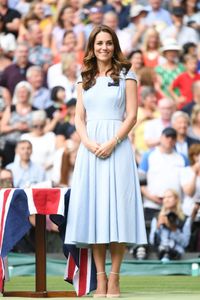14日に行われたウィンブルドン選手権男子シングルス決勝戦で、キャサリン妃はロンドン発エミリア・ウィックステッドのパウダーブルーのワンピースで、ブルーのネクタイにワイシャツ、グレーの背広姿のウィリアム王子とばっちりコーデして、ロイヤルボックス席で試合を観戦した。