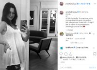 インスタグラムに投稿されたのは、自宅でスマホを見ているアンの様子を捉えたモノクロ写真だが、タンクトップにショートパンツ姿のアンのお腹が明らかに膨らんでいる。しかし昨年4月に、「太ったと言われないために、これから私が太るのは役作りのため」とわざわざインスタグラムで公表したアンとあって、今回のキャプションでも、「これは映画の役作りのためじゃないの。冗談はさておき…」と断りを入れて正式に妊娠を発表した。