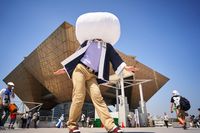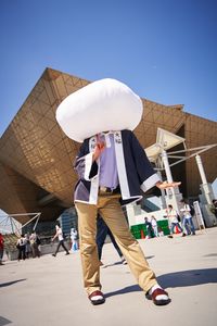 暑さがピークに達する14時頃、屋外のコスプレイヤーたちも次々と日陰に移動していくなか、西展示ホール横の屋上展示場に、ひと際目を引く参加者の姿があった。法被を着た巨大な大福が、2本の足で立って華麗にポーズを決めている。ご存じの方ならピンとくる、「日常」の隠れた人気者、「大福の中之条」のマスコットキャラクターである大福くんだ。同名のハンドルネームを持つ大福くんに話を聞くと、頭部の大福を少し持ち上げて、いきさつを話してくれた。
