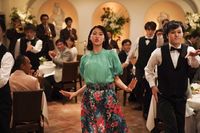 高級レストランでのシーンも強烈なインパクトを放つ。山本リンダのヒット曲「狙いうち」に合わせてのダンスだが、三吉が艶っぽい目つきで身体をしならせ、ギャラリーを挑発していく。その後、テーブルクロス引きを3連発で行うが、なんと三吉は1テイクで成功させたようだ。「レストランでのシーンは4日間くらいかけて、ブロックごとに撮っていきました。クロス引きは先生に教えていただきましたが、やってみると『ああ、こういうふうにすれば誰もができるんだ』と納得し、意外とできました。躊躇なく斜め下に引けば、大丈夫です(笑)」。