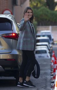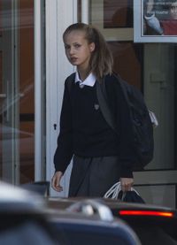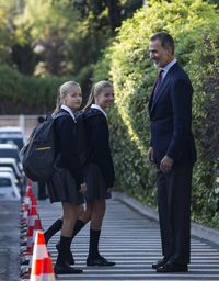 前髪をアップにしたポニーテールに、白いワイシャツと紺のVネックのセーター、グレーのスカートに紺のハーフソックスと黒いローファーという出で立ちのレオノール王女とソフィア王女が笑顔で登校する様子が捉えられているが、なんと今回は、父親のフェリペ6世国王が、グレーのズボンに紺のソックスと黒い靴、白いワイシャツに赤いネクタイと紺のジャケットと、娘たちとばっちりコーディネート。レティシア王妃は、黒のスキニーパンツにスニーカー、黒のインナーに白、黒、グリーンのグレンチェックのジャケットというカジュアルな装いで、娘たちに付き添った。