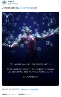実はキャメロン監督、『アベンジャーズ/エンドゲーム』が世界の歴代興収記録を塗り替えた際にツイッターで、マーベル・スタジオに向けてパンドラにいるアイアンマンの画像を添えて祝福のメッセージを送っている。それに対して『アベンジャーズ/エンドゲーム』の監督のジョー&アンソニー・ルッソ兄弟は「キャメロン監督、あなたは、僕たちが映画を好きになった偉大なる理由です。いつも僕らに刺激を与え、世界に無限な可能性を示してくれてありがとう。あなたが僕らを次はどんな世界に連れていってくれるのか、楽しみにしています」と、返信をしている。
