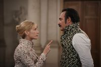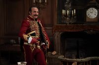 デュジャルダンは、豪華絢爛な赤い騎兵服とピンと跳ね上がった口ひげで紳士を装う“嘘つき男”ヌヴィル大尉になりきっている。ひょんなことから共犯関係になったエリザベットから白い眼を向けられても、まったく気にも留めず、戦地で自分の身に起きた“作り話”を朗々と語り、社交界の聴衆を魅了していく。