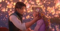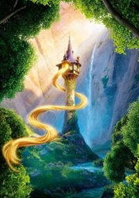 自分の髪をロープ代わりにして塔から降りてくるラプンツェル [C] Disney Enterprises, Inc.