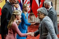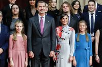 前日のレセプションでは、レティシア王妃はアップにしたヘアスタイルにグレーのワンピース、エンジのパンプスと地味めのファッションで、ソフィア王女はオレンジのワンピースにシルバーのフラットシューズ、レオノール王女は白いワンピースに茶、黄色、オレンジ、白の模様が施されたコートジャケットにベージュのフラットシューズという装い。