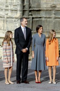 その後、観衆を前にしたセレモニーでは、レティシア王妃はアップにしたヘアスタイルにフェリペ・バレラのボルドー系のフレアスカートワンピースとスウェードのパンプスでコーデし、シルバーのクラッチバッグとイヤリングで相変わらずミニマルな装い。ソフィア王女はツイードのベージュ系のシンプルなワンピースにシルバーのフラットシューズを履き回し、レオノール王女は珍しく水色のフレアスカートワンピースにベージュのフラットシューズを履き回し、エレガントながら2人の個性がバッチリ表れるファッションセンスを見せつけた。