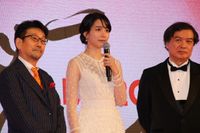 『百円の恋』(14)の脚本家、足立紳が、監督&脚本を手掛けた映画『喜劇 愛妻物語』で、濱田岳や監督と登場した水川あさみ。デコルテが美しいドレスで、幸せオーラ全開の笑顔を見せていた。