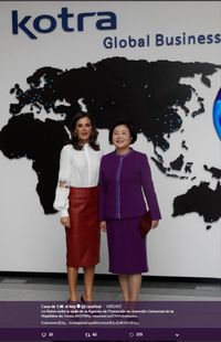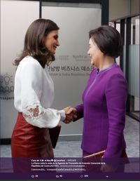 韓国エキスポで、黒地にカラフルな水玉がプリントされたマッシモドゥッティから着替えたレティシア王妃は、袖のレース使いがオシャレなキャロリーナ・へレラの白いシルクのスタンドカラーブラウスに、369ポンド(約5万1600円)のヒューゴ・ボスのエンジのタイトスカートとスウェードの同色のパンプスという、秋らしくシンプルな出で立ちで韓国のスペイン人コミュニティを訪れた。しかしその翌日、エリザベス女王がパトロンを務める「The Queens Commonwealth Trust」と世界ユースサミットが共同で行ったラウンドテーブルディスカッションにヘンリー王子と共に出席した際のメーガン妃が、同じブランドかつ同じ色のスカートで登場。