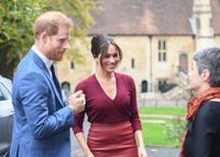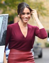 アップにまとめたヘアスタイルに、Vネックのバーガンディのニットトップ、エンジのスウェードのパンプスという装いは上下とも新アイテム。2018年10月にもメーガン妃は同じブランドのグリーンのタイトスカートを履いていたことから、レティシア王妃をお手本にしたというよりは、むしろレティシア王妃がメーガン妃のファッションを参考にしたのかもしれない。